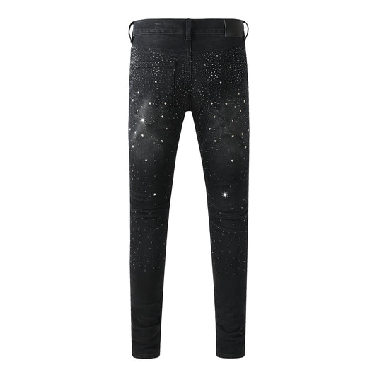 Mens Black Skinny Jeans with Gradient Rhinestone Embellishment Sparkling Night Sky Inspired Denim 9130