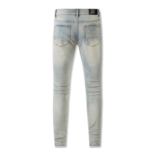 848 Blue Distressed Jeans with Muddy Yellow Wash and Faux Leather Patches for a Vintage Look