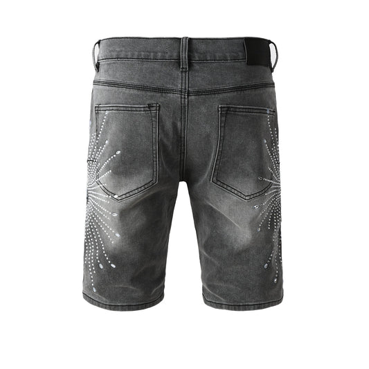 Men’s Grey Washed Denim Shorts with Sparkling Studded Sunburst Design Streetwear Fashion Style 5094