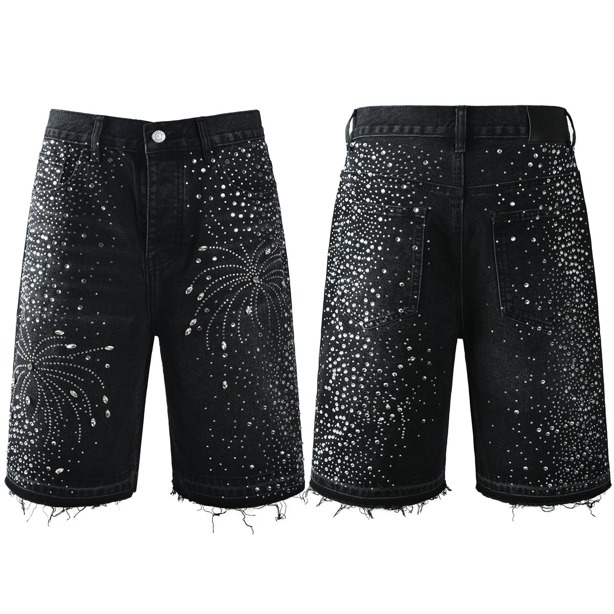 Men’s Black Rhinestone Denim Shorts with Firework Crystal Design 5103